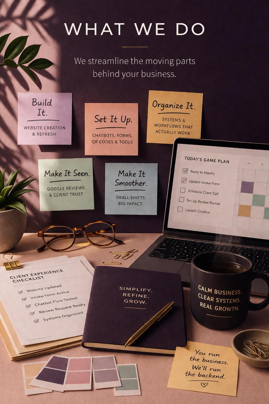 We streamline the moving parts behind your business.That can mean building or refining your website so it clearly explains what you offer. It can mean organizing your tools and processes so your day-to-day runs more smoothly. It can mean setting up simple digital systems like client intake forms, QR review funnels, or chatbots so you can stop doing everything manually and get back to business.We don’t overcomplicate. We refine.Small shifts. Clear systems. Sustainable growth.