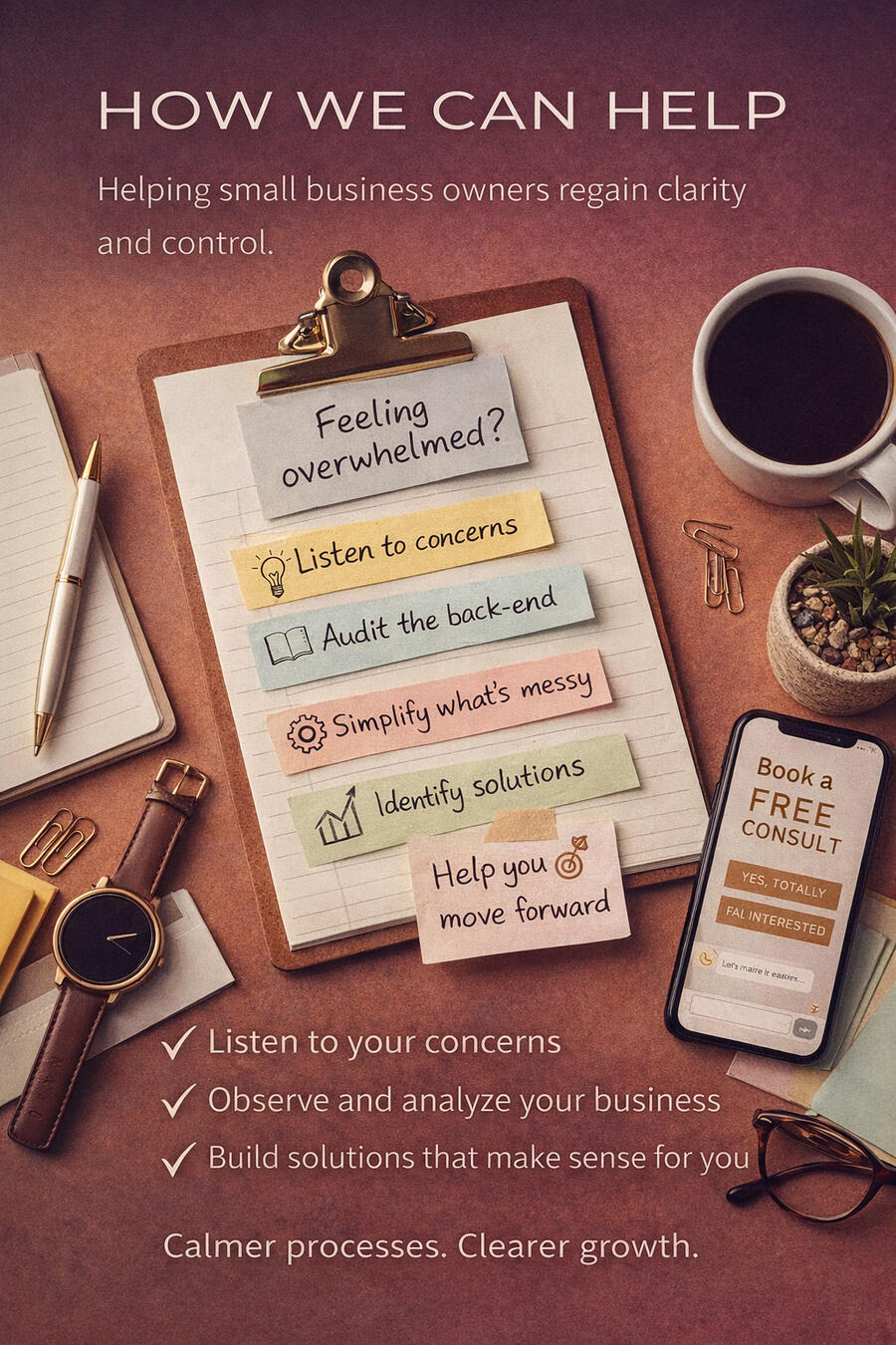 If parts of your business feel repetitive or disorganized, we observe, ask questions, and suggest clearer ways to manage what you’re already doing.